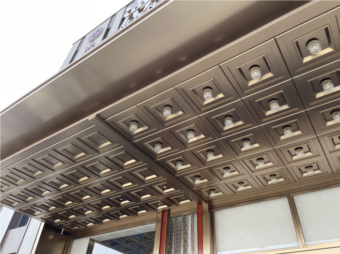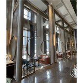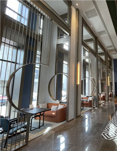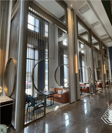 大廳圓形鏤空不銹鋼屏風(fēng)打造出一個個相互聯(lián)系卻又相對獨(dú)立的空間